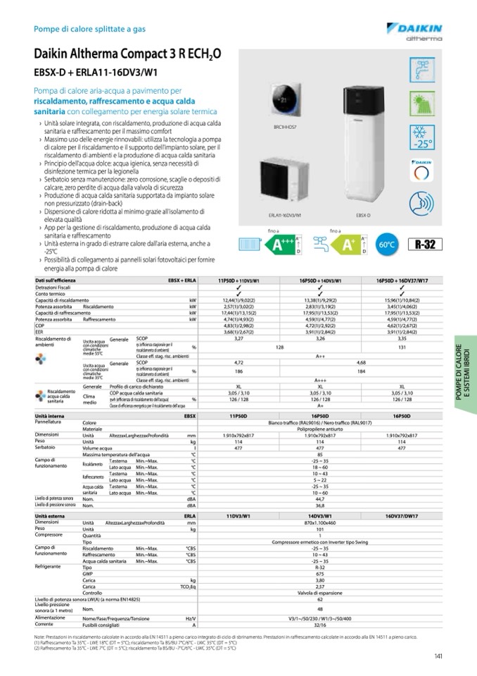 Note: Prestazioni in riscaldamento calcolate in accordo alla EN 14511 a pieno carico integrato di ciclo di sbrinamento. Prestazioni in raffrescamento calcolate in accordo alla EN 14511 a pieno carico.