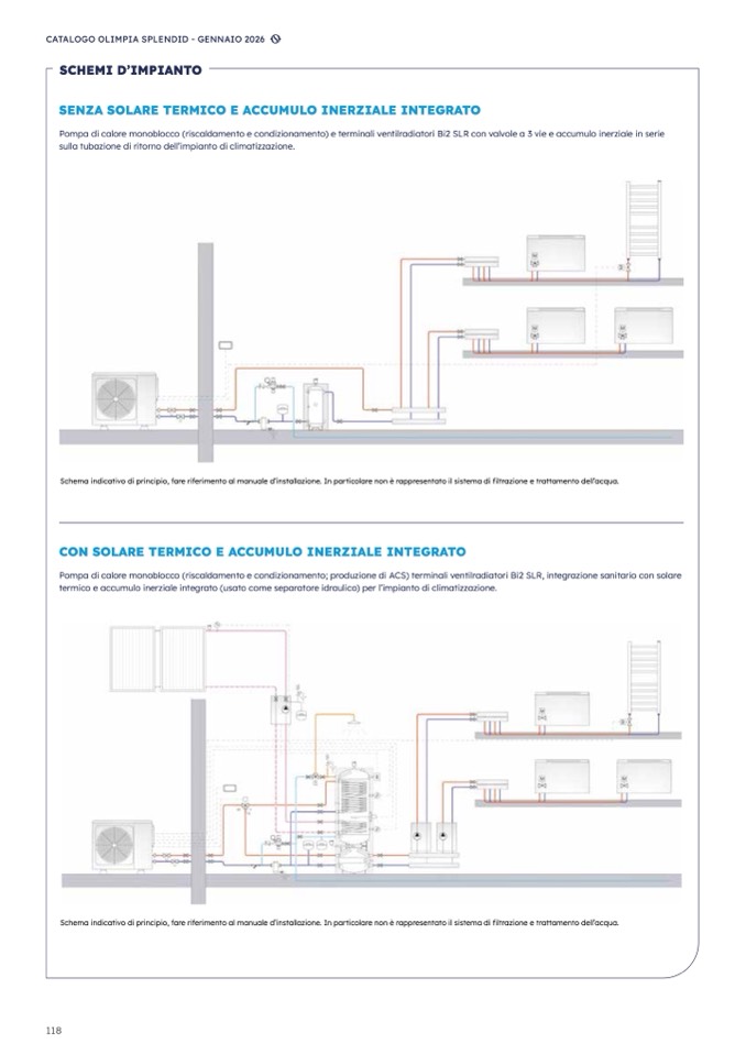 Pompa di calore monoblocco (riscaldamento e condizionamento) e terminali ventilradiatori Bi2 SLR con valvole a 3 vie e accumulo inerziale in serie