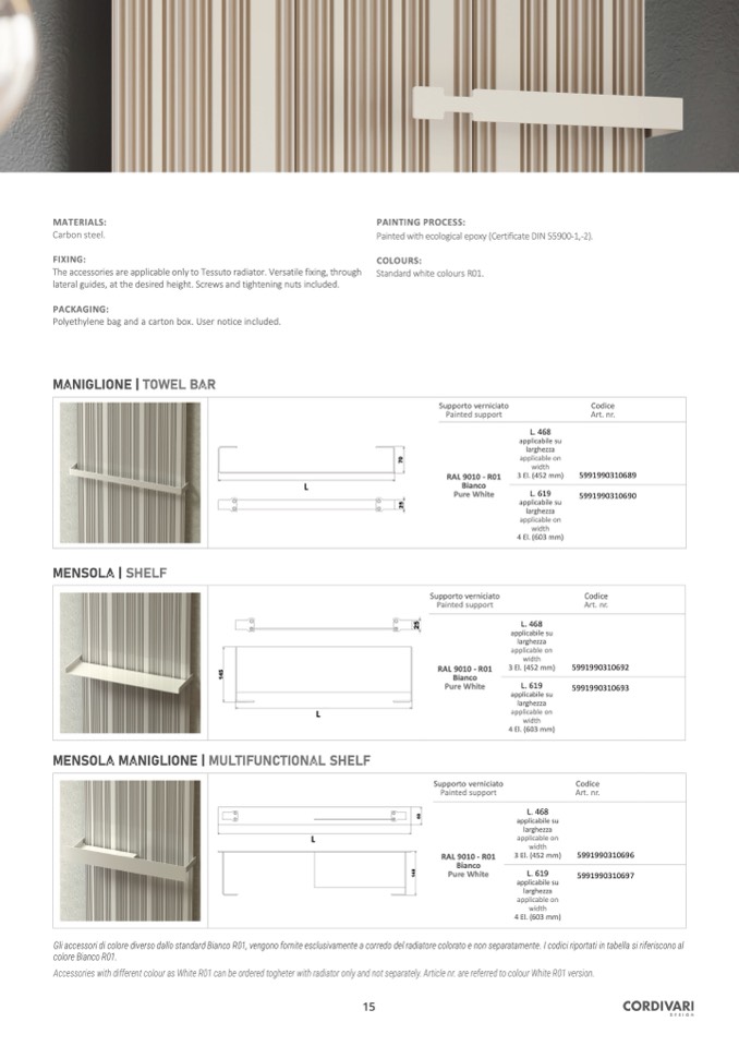 Accessories with different colour as White R01 can be ordered togheter with radiator only and not separately. Article nr. are referred to colour White R01 version.