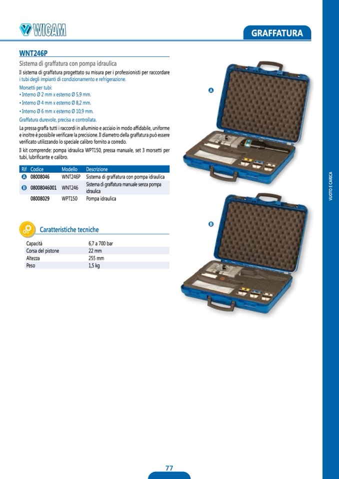 Il kit comprende: pompa idraulica WPT150, pressa manuale, set 3 morsetti per