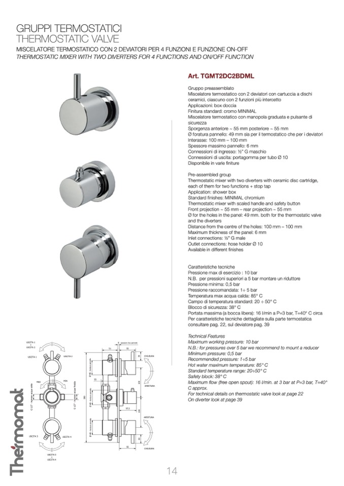 THERMOSTATIC MIXER WITH TWO DIVERTERS FOR 4 FUNCTIONS AND ON/OFF FUNCTION