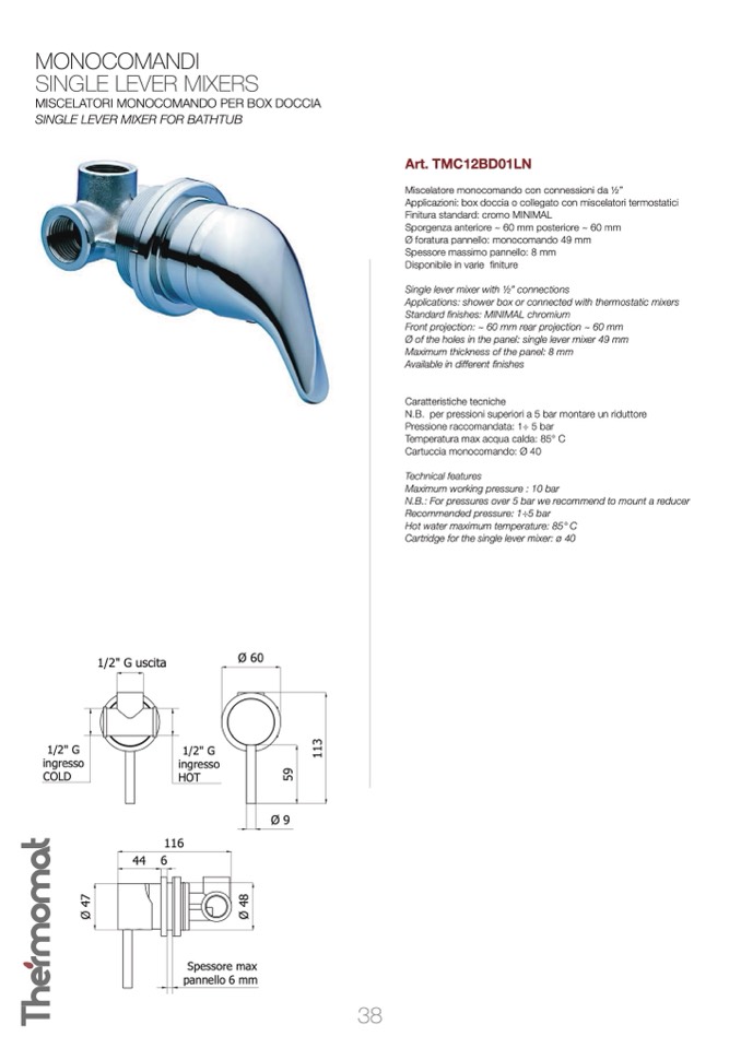 Ø foratura pannello: monocomando 49 mm