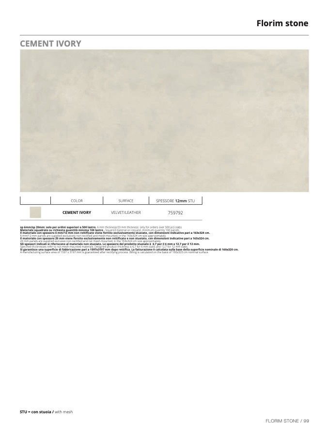 sp 6mm/sp 20mm: solo per ordini superiori a 500 lastre. 6 mm thickness/20 mm thickness: only for orders over 500 pcs slab