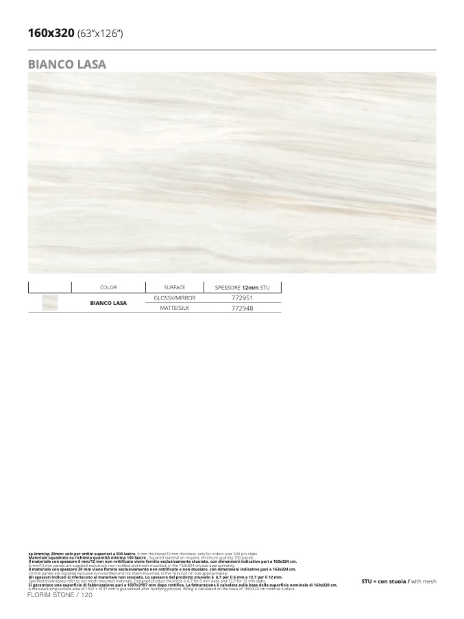 sp 6mm/sp 20mm: solo per ordini superiori a 500 lastre. 6 mm thickness/20 mm thickness: only for orders over 500 pcs slab