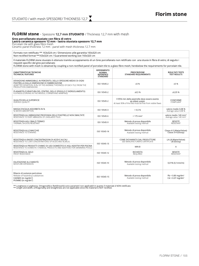 FLORIM stone with mesh is obtained by coupling a non-rectified panel of porcelain tile to a glass fibre mesh; herebelow the requirements for porcelain tile