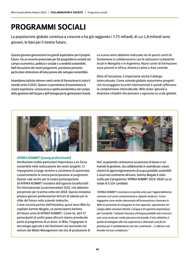 Wilo Sustainability Report 2019 | COLLABORATORI E SOCIETÀ | Programmi sociali