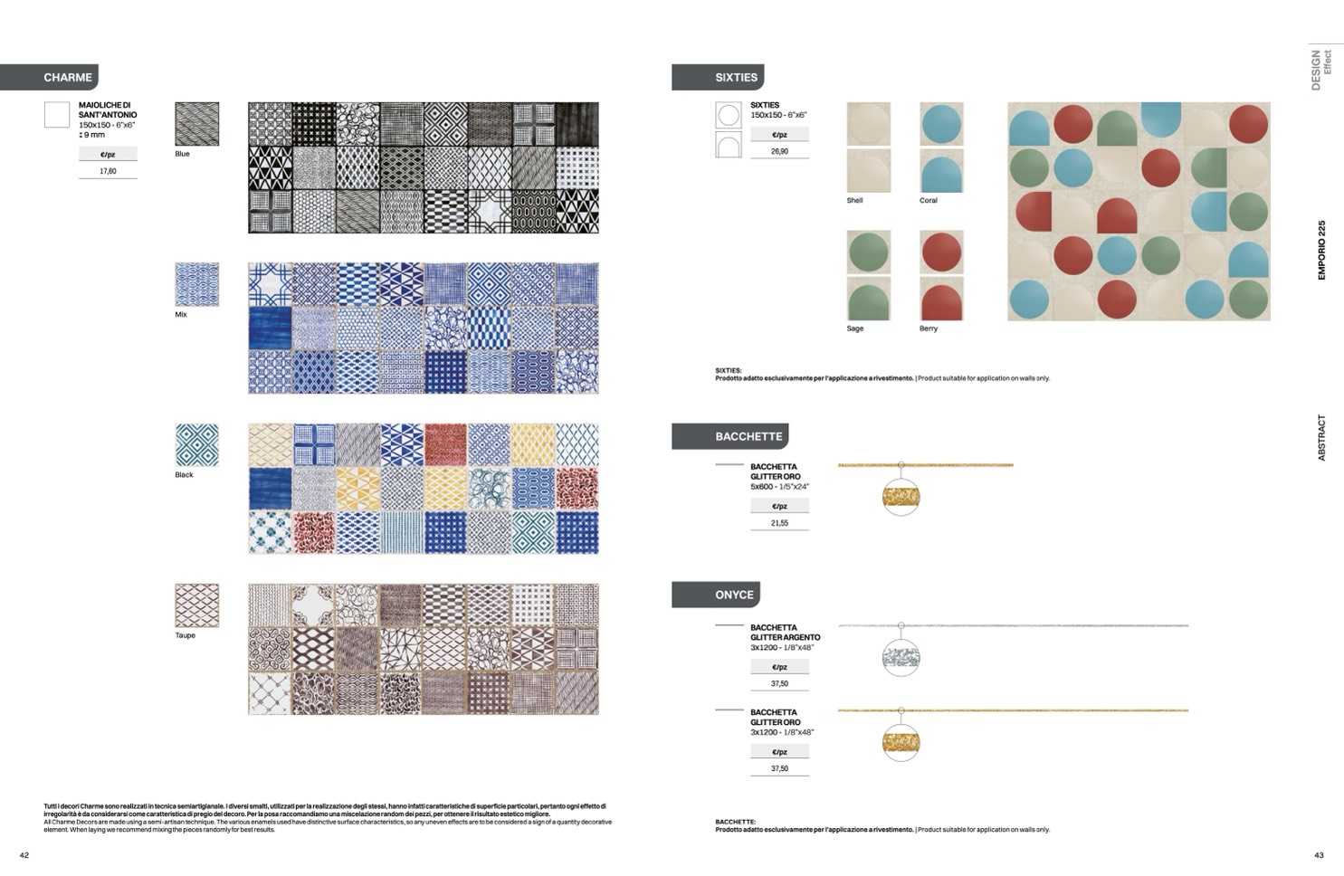 Tutti i decori Charme sono realizzati in tecnica semiartigianale. I diversi smalti, utilizzati per la realizzazione degli stessi, hanno infatti caratteristiche di superficie particolari, pertanto ogni effetto di