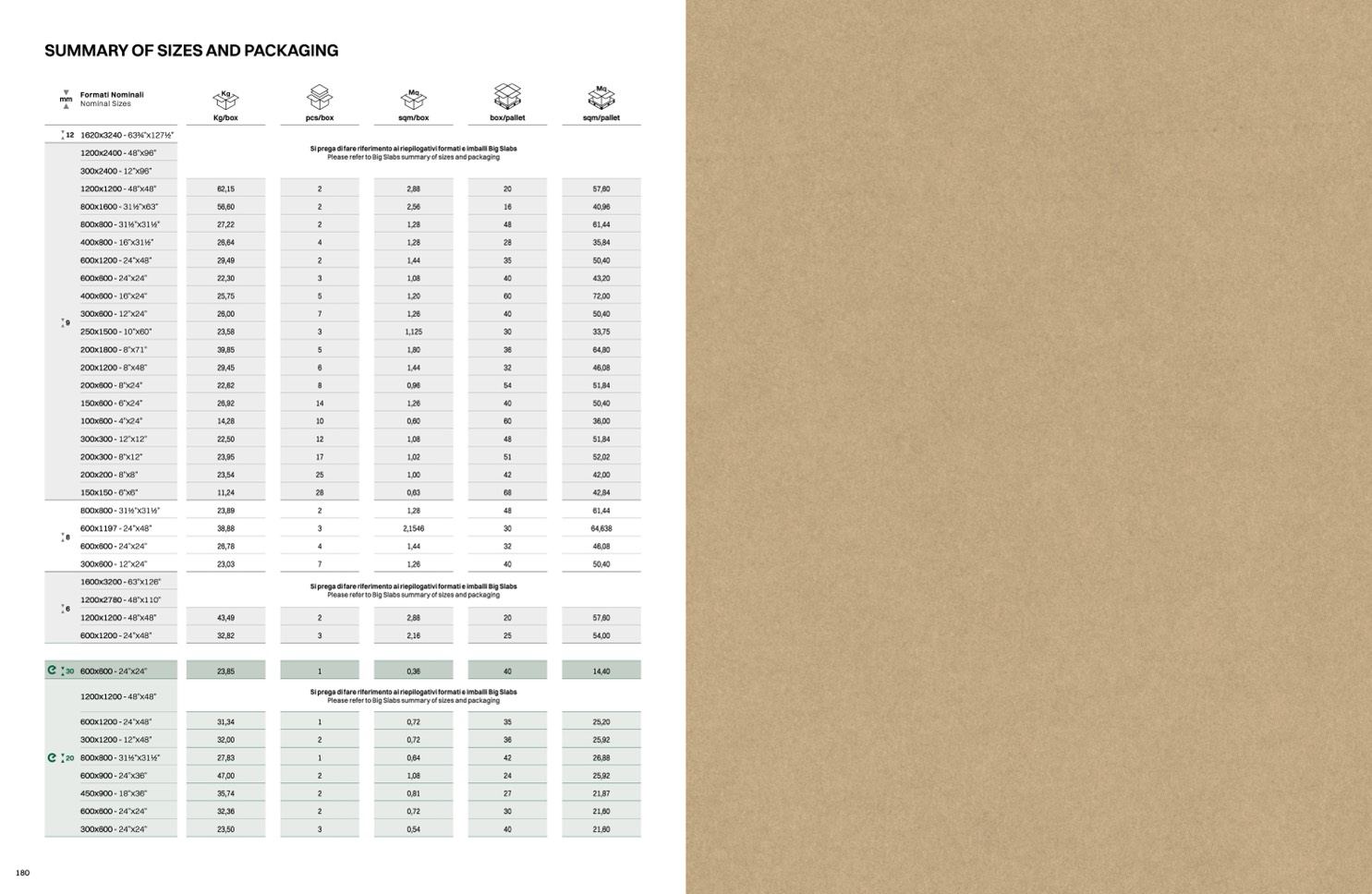 Si prega di fare riferimento ai riepilogativi formati e imballi Big Slabs