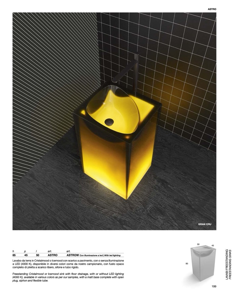 Lavabo da terra in Cristalmood o Icemood con scarico a pavimento, con o senza illuminazione