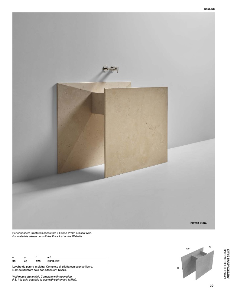 Lavabo da parete in pietra. Completo di piletta con scarico libero.