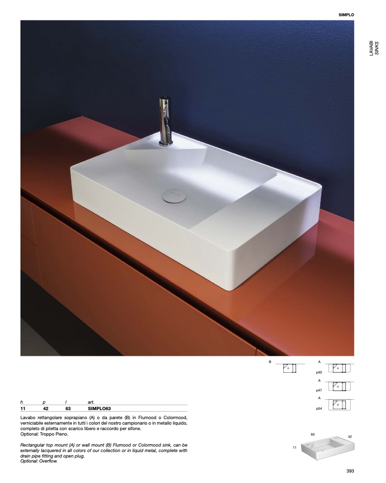 Lavabo rettangolare soprapiano (A) o da parete (B) in Flumood o Colormood,