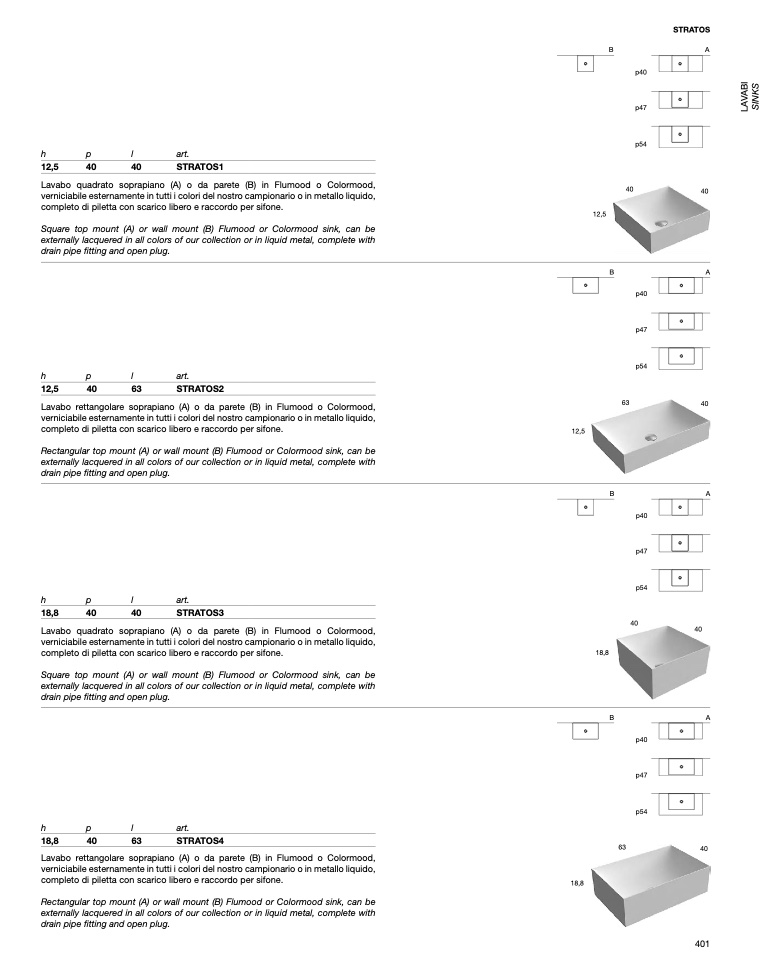 Square top mount (A) or wall mount (B) Flumood or Colormood sink, can be
