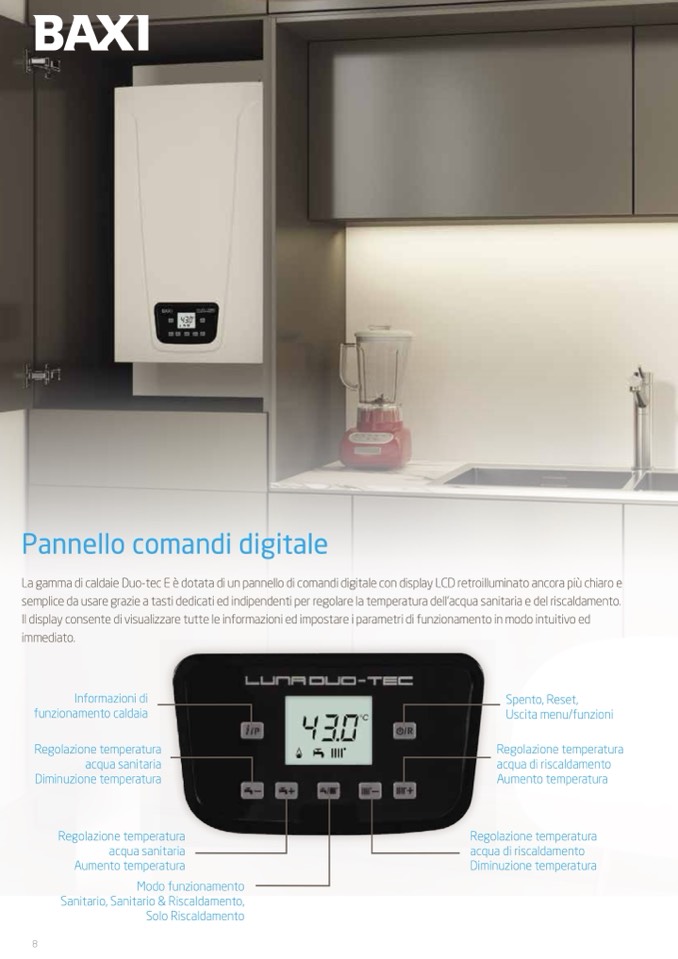 semplice da usare grazie a tasti dedicati ed indipendenti per regolare la temperatura dell’acqua sanitaria e del riscaldamento.