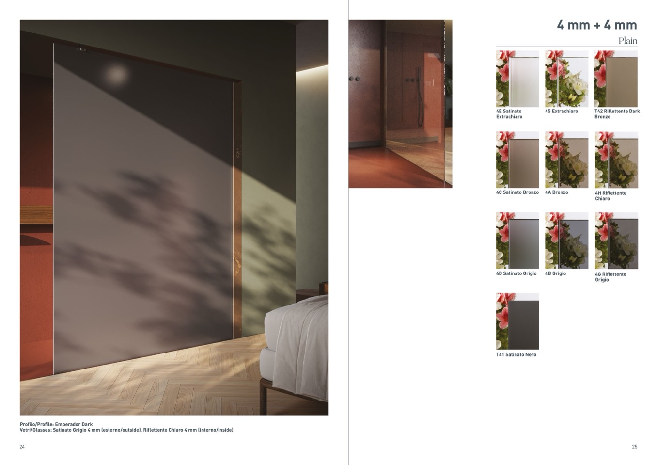 Vetri/Glasses: Satinato Grigio 4 mm (esterno/outside), Riflettente Chiaro 4 mm (interno/inside)