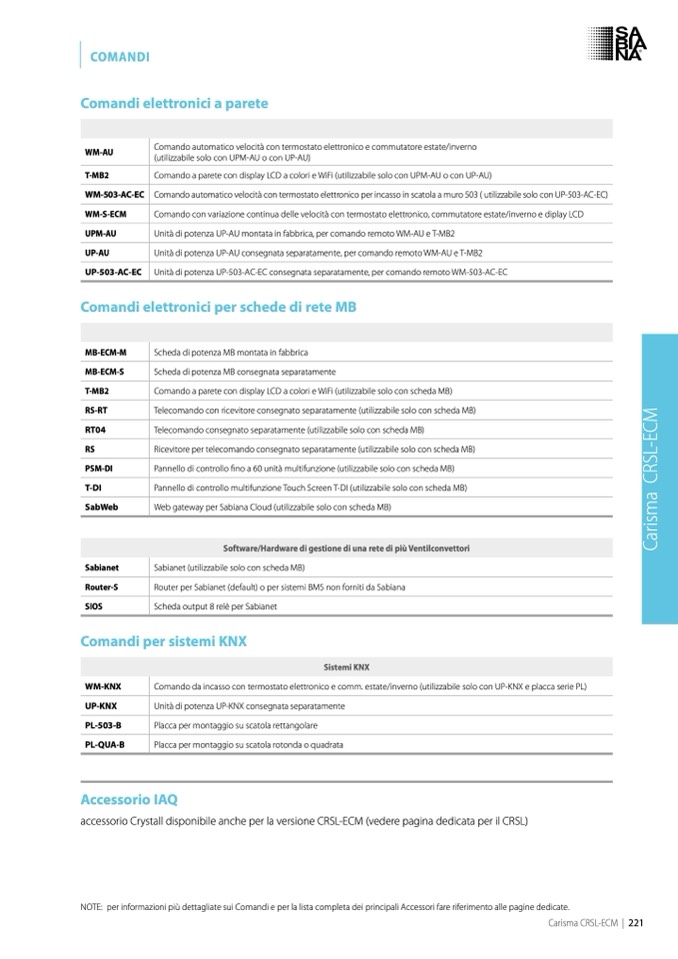 NOTE: per informazioni più dettagliate sui Comandi e per la lista completa dei principali Accessori fare riferimento alle pagine dedicate.
