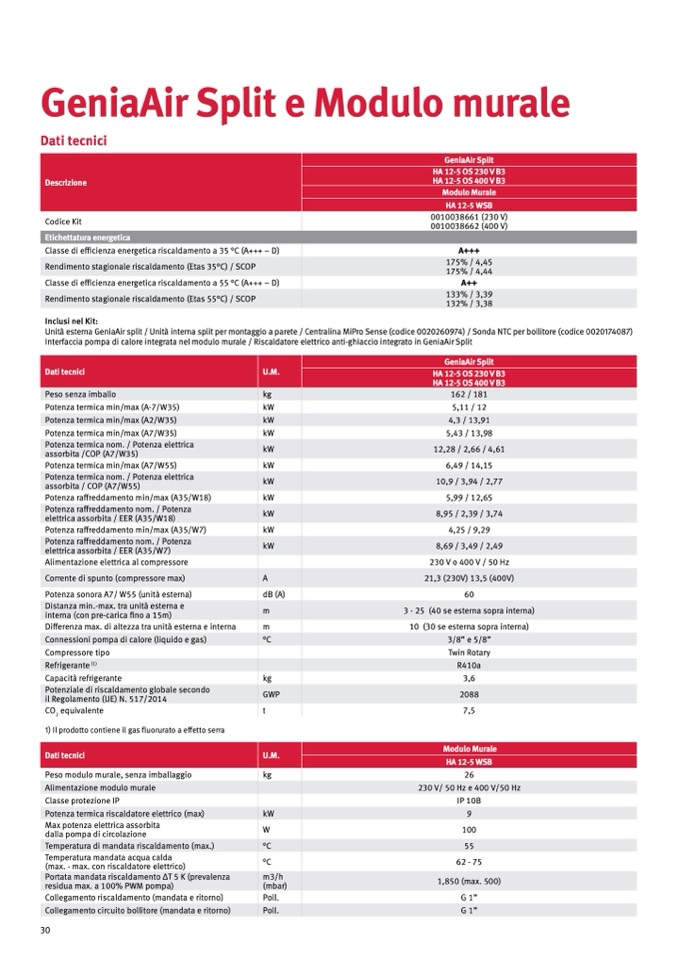 Unità esterna GeniaAir split / Unità interna split per montaggio a parete / Centralina MiPro Sense (codice 0020260974) / Sonda NTC per bollitore (codice 0020174087