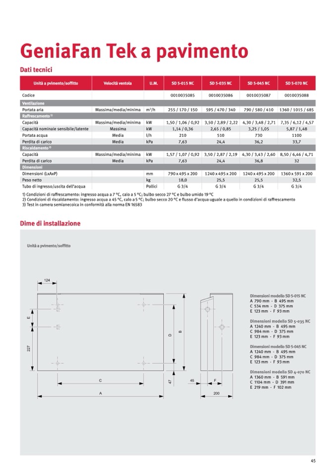 2) Condizioni di riscaldamento: ingresso acqua a 45 °C, calo a 5 °C; bulbo secco 20 °C e flusso d’acqua uguale a quello in condizioni di raffrescament