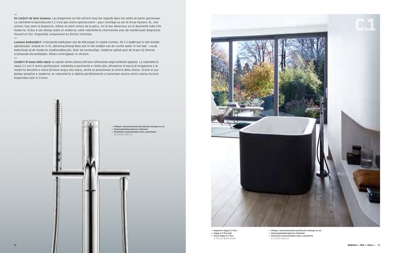 La robinetterie bain/douche C.1 n’est pas moins spectaculaire : pour montage au sol et d’une hauteur XL, elle