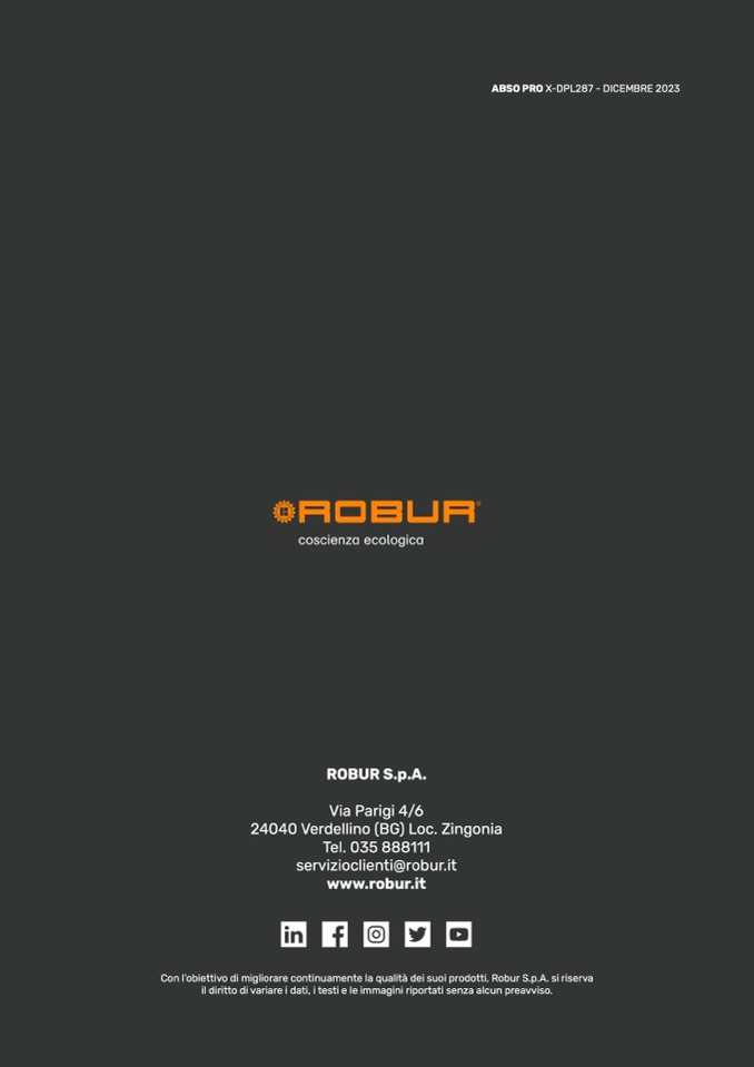 Con l’obiettivo di migliorare continuamente la qualità dei suoi prodotti, Robur S.p.A. si riserva