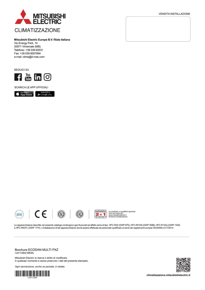 Le apparecchiature descritte nel presente catalogo contengono gas fluorurati ad effetto serra di tipo HFC-R32 (GWP 675), HFC-R410A (GWP 2088), HFC-R134a (GWP 1430)