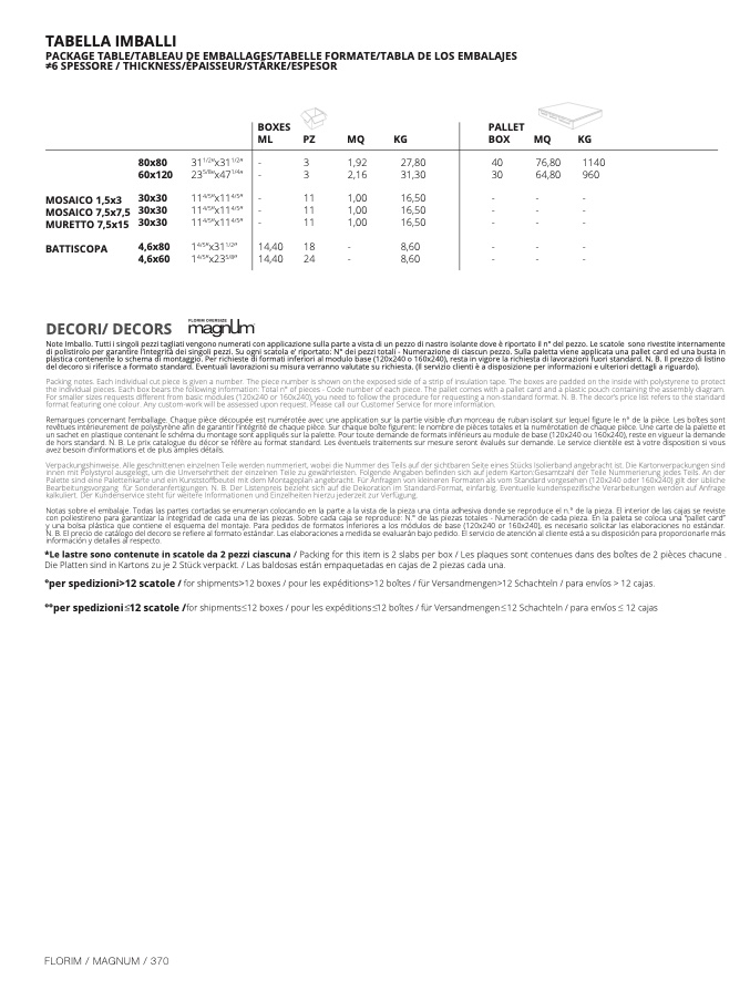 stirolo per garantire l’integrità dei singoli pezzi. Su ogni scatola e’ riportato: N° dei pezzi totali - Numerazione di ciascun pezzo. Sulla paletta viene applicata una pallet card ed una busta i