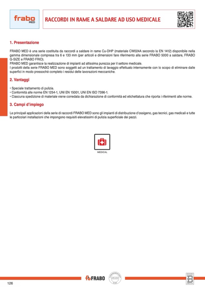 FRABO MED è una serie costituita da raccordi a saldare in rame Cu-DHP (materiale CW024A secondo la EN 1412) disponibile nella
