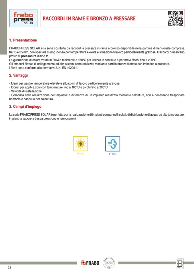 FRABOPRESS SOLAR è la serie costituita da raccordi a pressare in rame e bronzo disponibile nella gamma dimensionale compresa