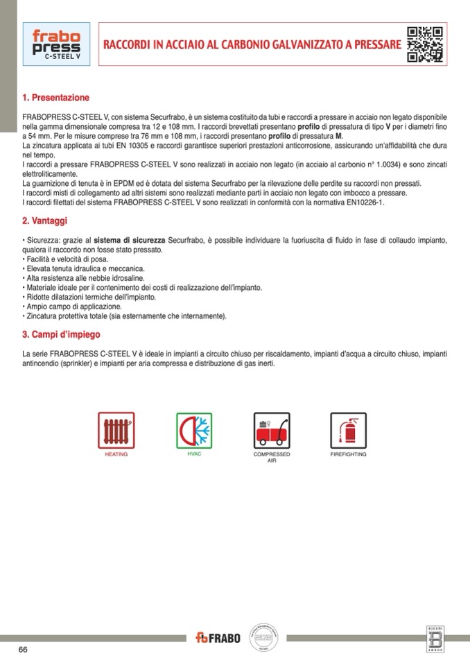 nella gamma dimensionale compresa tra 12 e 108 mm. I raccordi brevettati presentano profilo di pressatura di tipo V per i diametri fino