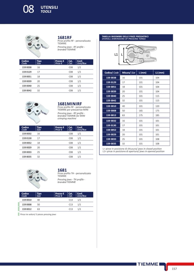 TABELLA INGOMBRI DELLE PINZE PRESSATRICI