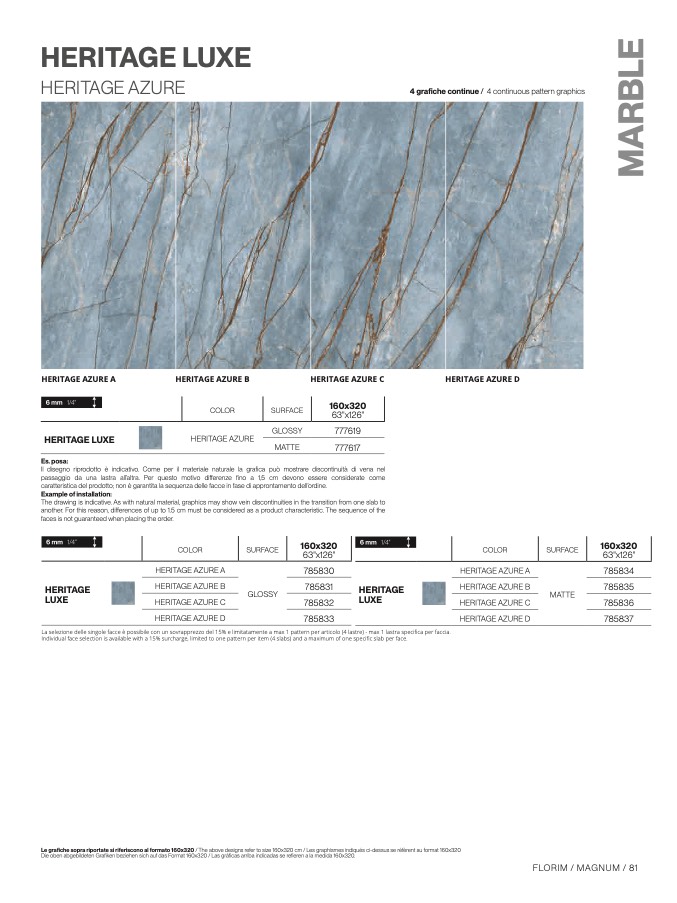 La selezione delle singole facce è possibile con un sovrapprezzo del 15% e limitatamente a max 1 pattern per articolo (4 lastre) - max 1 lastra speci