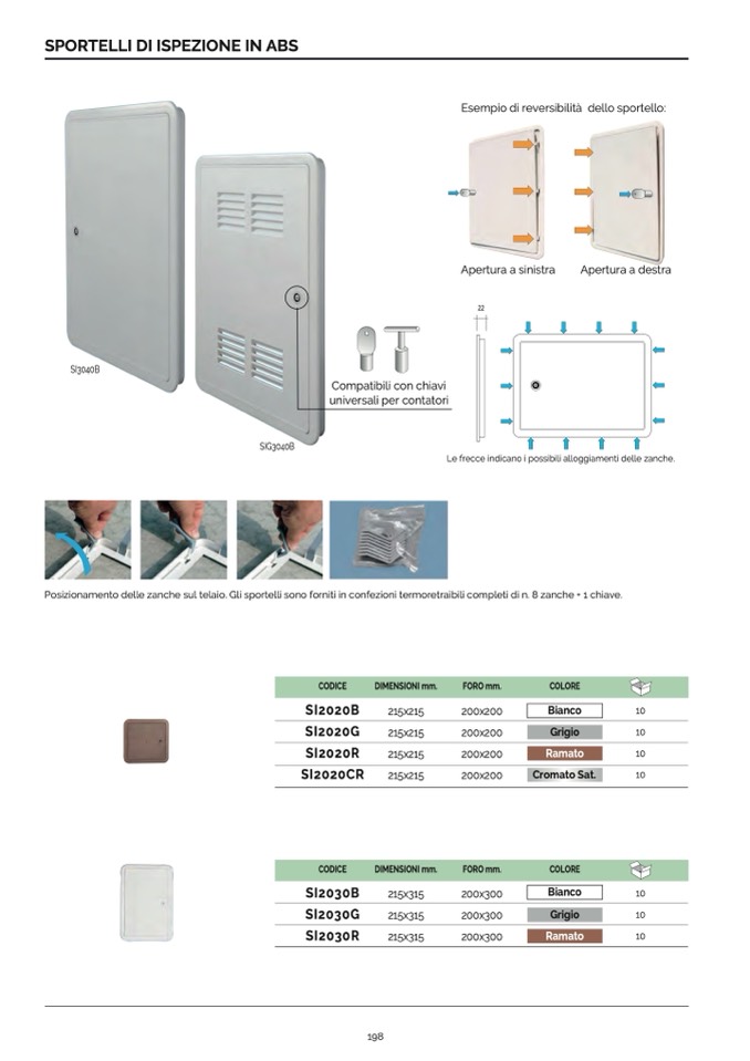 Posizionamento delle zanche sul telaio. Gli sportelli sono forniti in confezioni termoretraibili completi di n. 8 zanche + 1 chiave.