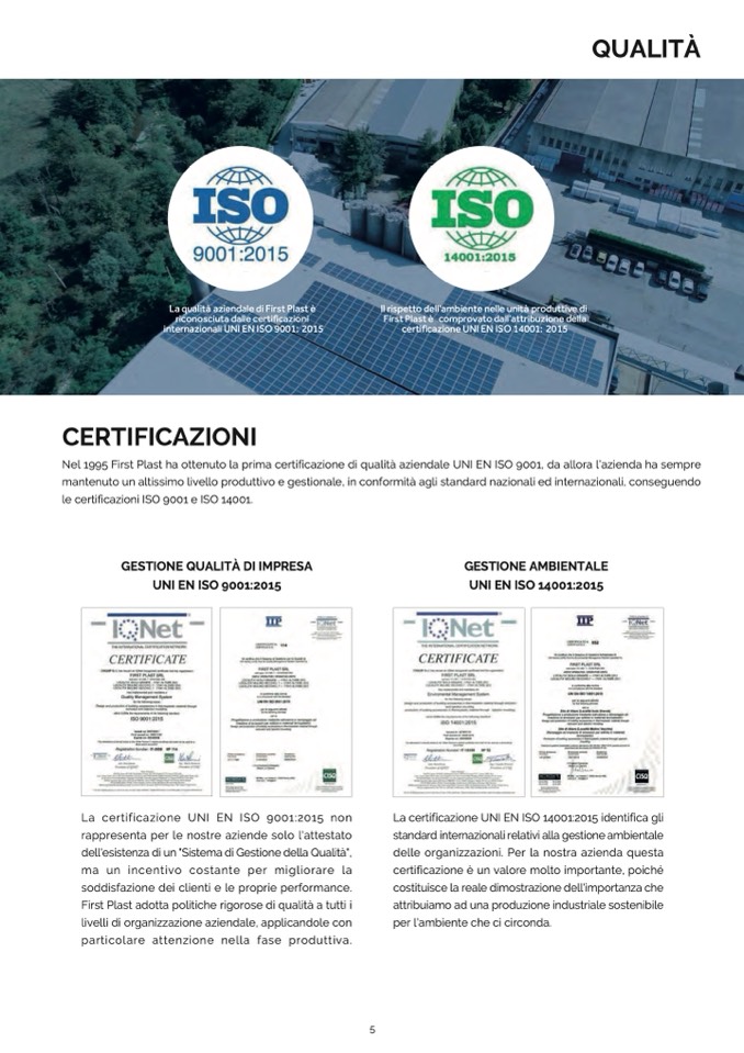 Nel 1995 First Plast ha ottenuto la prima certificazione di qualità aziendale UNI EN ISO 9001, da allora l’azienda ha sempre