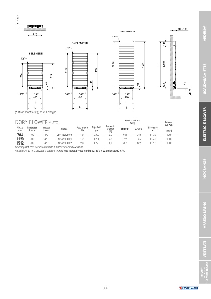 Per Δt diversi da 50°C, utilizzare la seguente formula: resa ricercata = resa termica a Δt 50°C x (Δt desiderata/50°C)^n.