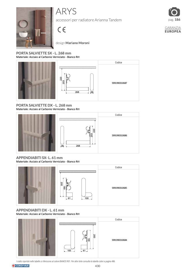 I codici riportati nelle tabelle si riferiscono al colore BIANCO R01. Per altre tinte consulta la tabella colori a pagina 486.