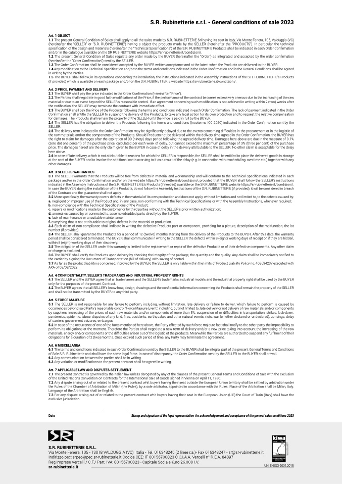1.1 The present General Condition of Sales shall apply to all the sales made by S.R. RUBINETTERIE Srl having its seat in Italy, Via Monte Fenera, 105, Valduggia (VC)