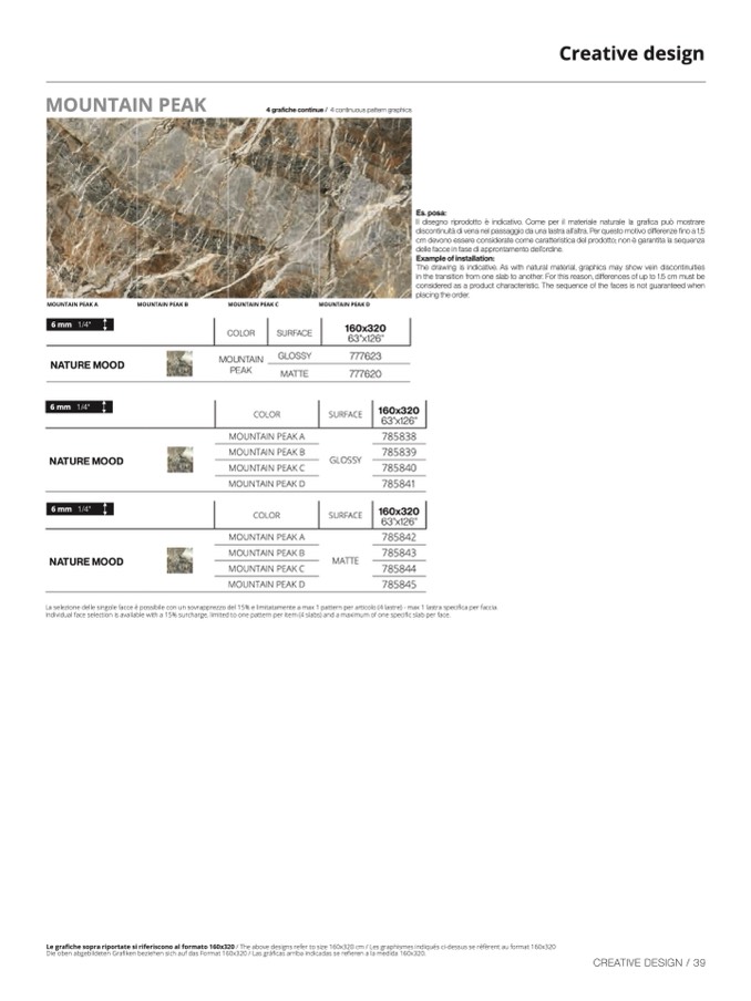 La selezione delle singole facce è possibile con un sovrapprezzo del 15% e limitatamente a max 1 pattern per articolo (4 lastre) - max 1 lastra specifica per faccia.