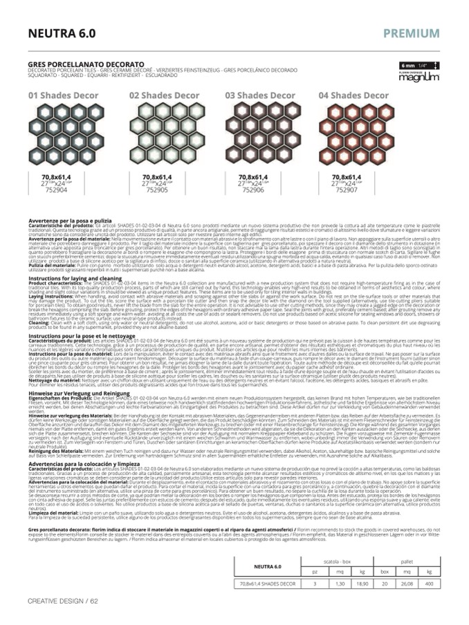 cterísticas del producto: Los artículos SHADES 01-02-03-04 de Neutra 6.0 son elaborados mediante un nuevo sistema de producción que no prevé la cocción a altas temperaturas, como las baldosa