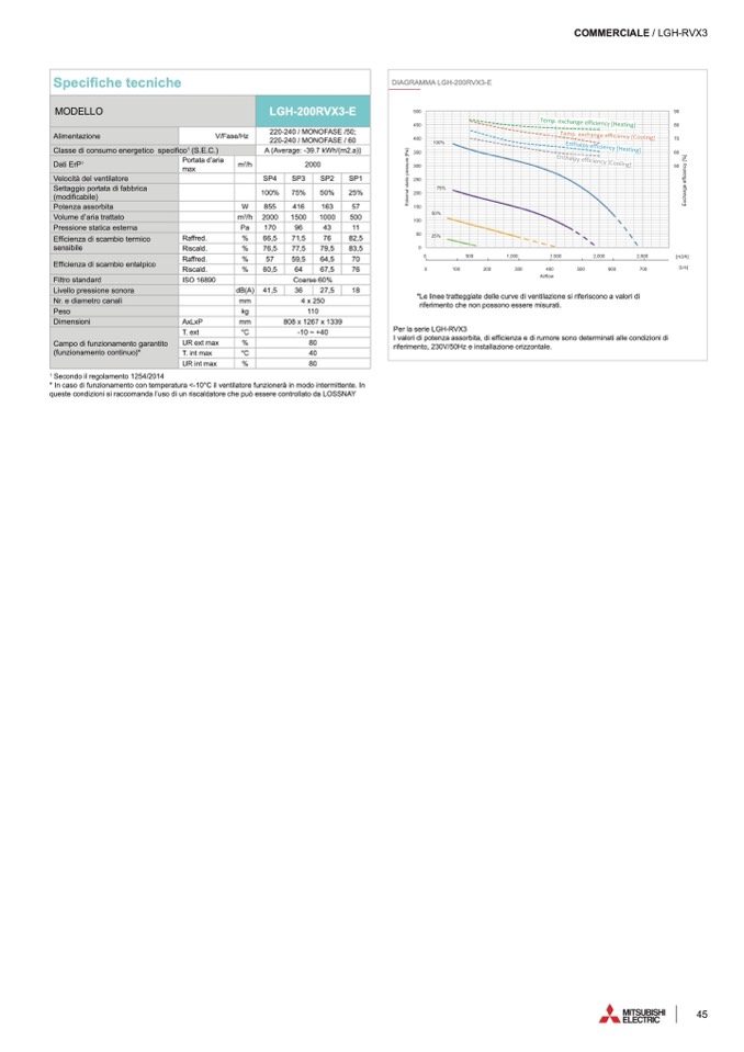 I valori di potenza assorbita, di efficienza e di rumore sono determinati alle condizioni di
