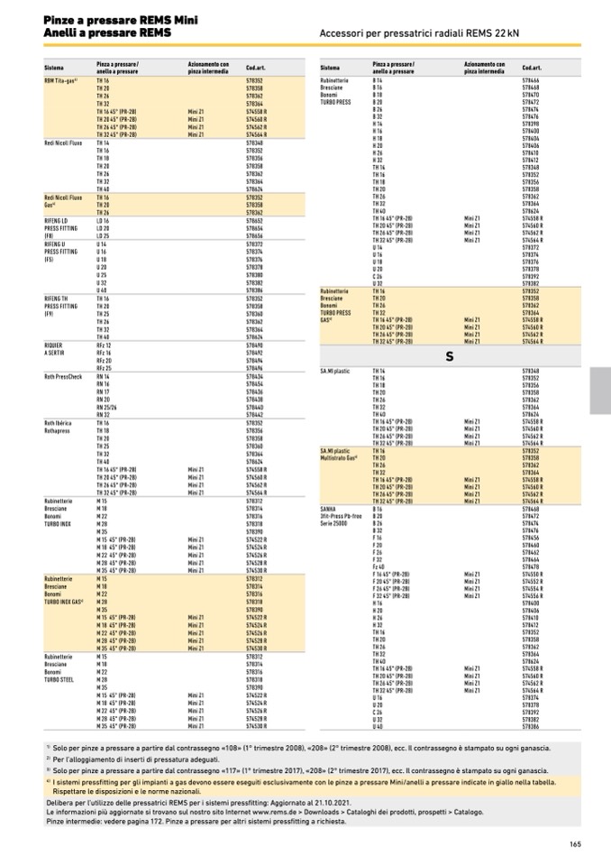 I sistemi pressfitting per gli impianti a gas devono essere eseguiti esclusivamente con le pinze a pressare Mini/anelli a pressare indicate in giallo nella tabella.
