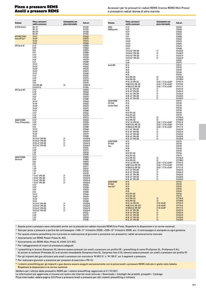 I sistemi pressfitting per gli impianti a gas devono essere eseguiti esclusivamente con le pinze/anelli a pressare REMS indicate in giallo nella tabella.