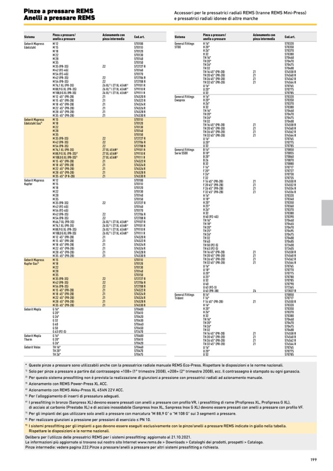 I sistemi pressfitting per gli impianti a gas devono essere eseguiti esclusivamente con le pinze/anelli a pressare REMS indicate in giallo nella tabella.