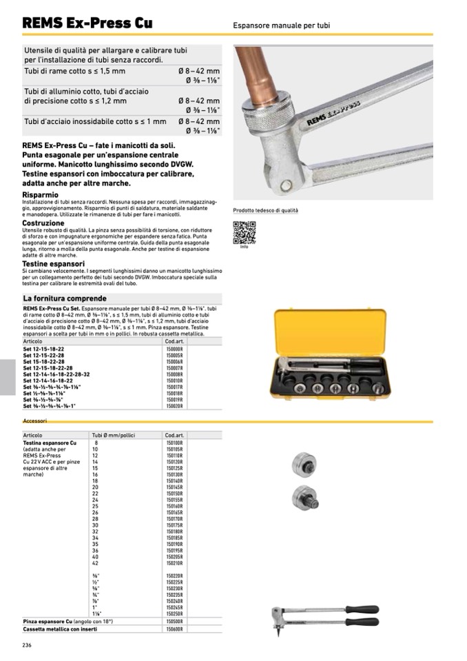 espansori a scelta per tubi in mm o in pollici. In robusta cassetta metallica.