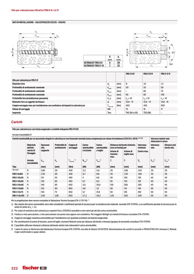 7) I valori di carico si riferiscono alla Valutazione Tecnica Europea ETA-17/0740, con data di rilascio 23/10/2018. Determinazione dei carichi in accordo a TR055/ETAG 001, Annesso C, Metodo