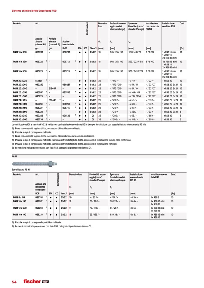 La certificazione ICC e sismica C1/C2 è valida solo per installazione con barra RG M (non per installazione con bussola filettata internamente RG MI).