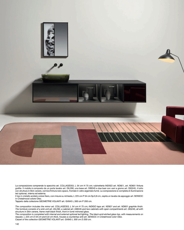 The composition includes the mirror art. COLLAGE353, L 54 cm H 75 cm; INDIGO taps art. ND921 and art. ND601 graphite