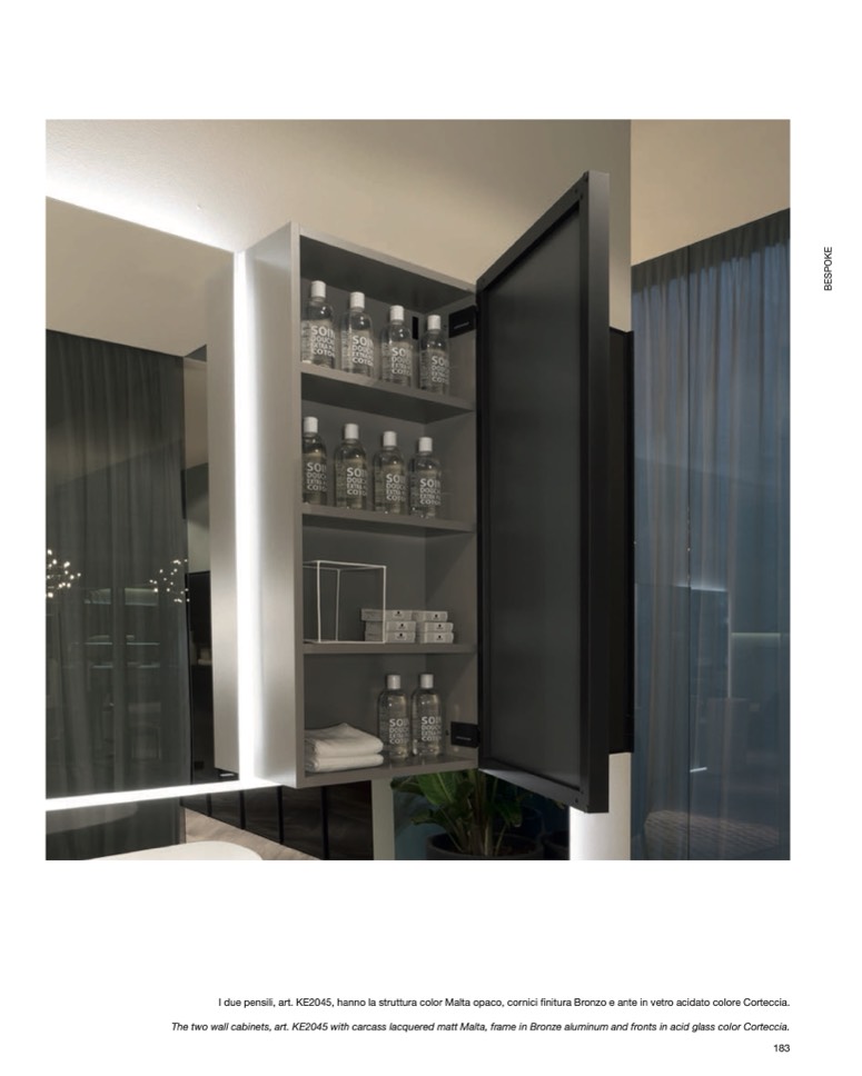 The two wall cabinets, art. KE2045 with carcass lacquered matt Malta, frame in Bronze aluminum and fronts in acid glass color Corteccia.