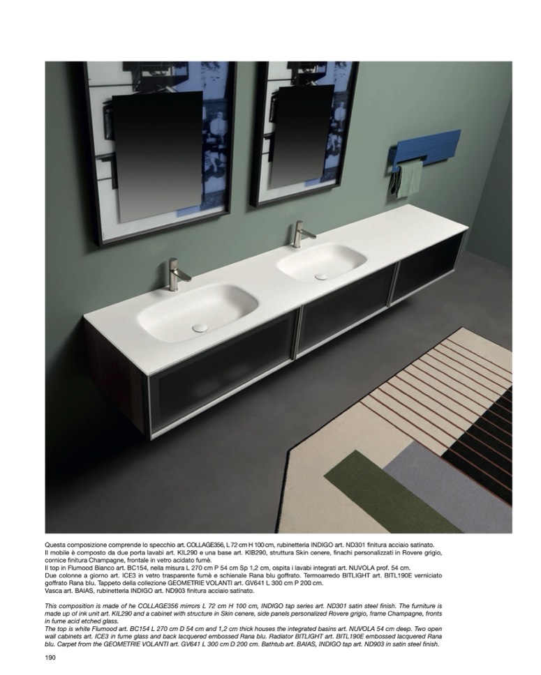 The top is white Flumood art. BC154 L 270 cm D 54 cm and 1,2 cm thick houses the integrated basins art. NUVOLA 54 cm deep. Two open