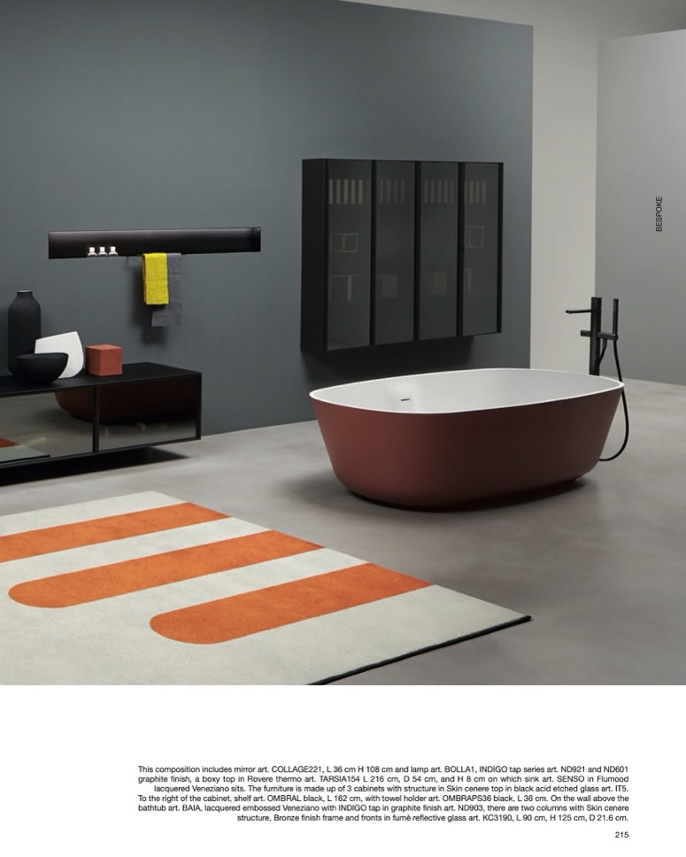 bathtub art. BAIA, lacquered embossed Veneziano with INDIGO tap in graphite finish art. ND903, there are two columns with Skin cenere