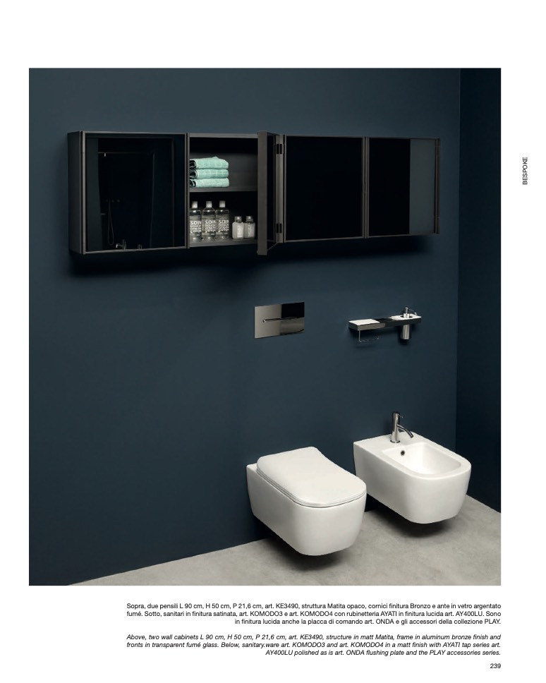 fumé. Sotto, sanitari in finitura satinata, art. KOMODO3 e art. KOMODO4 con rubinetteria AYATI in finitura lucida art. AY400LU. Sono