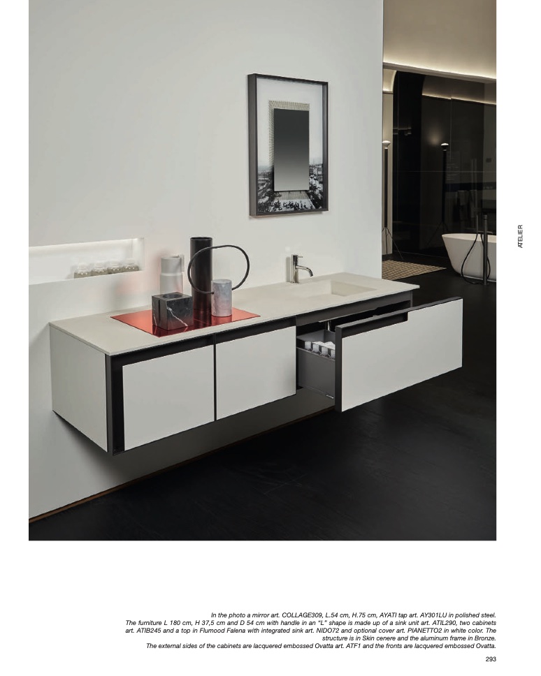 art. ATIB245 and a top in Flumood Falena with integrated sink art. NIDO72 and optional cover art. PIANETTO2 in white color. The
